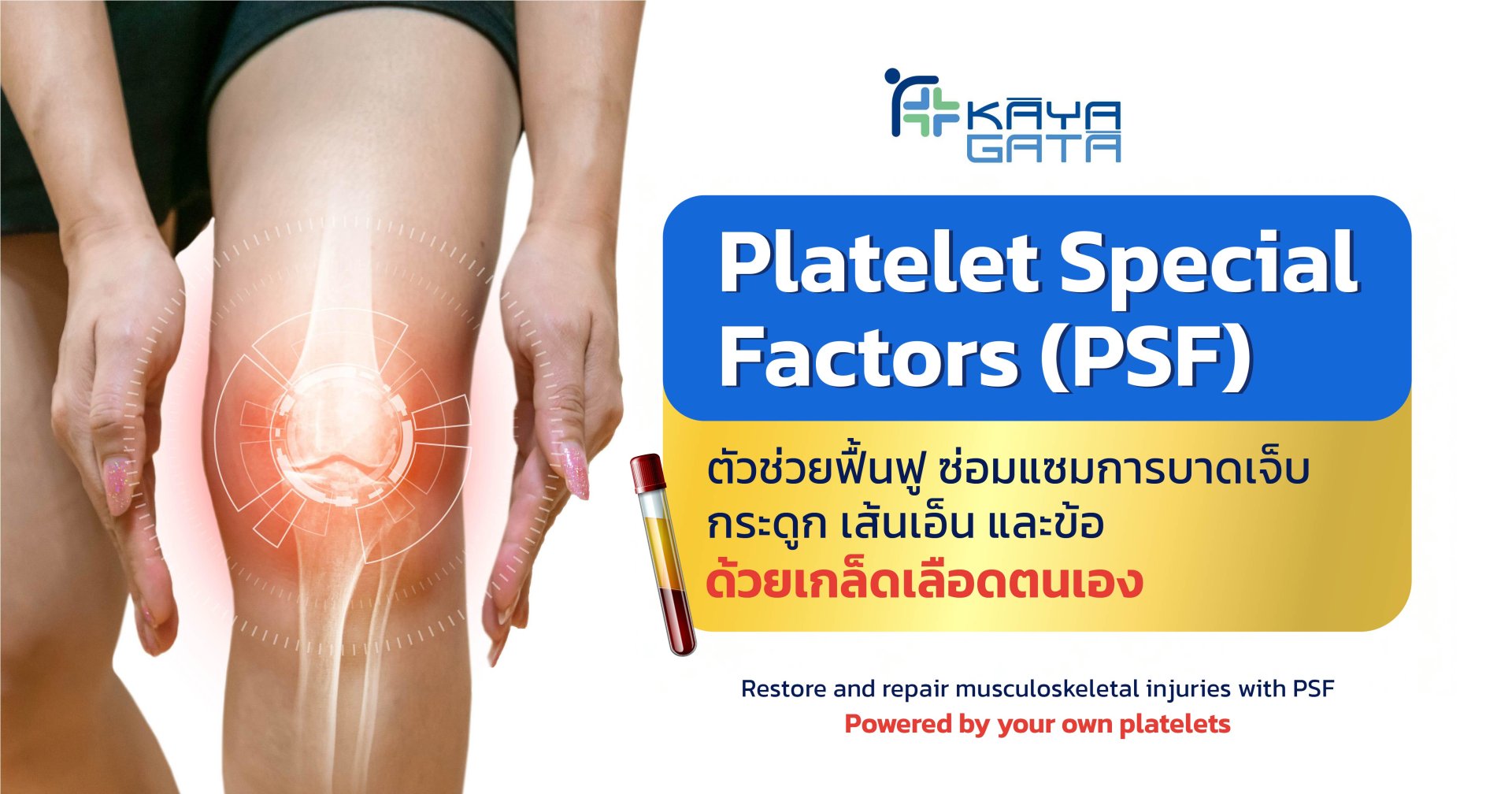 Platelet Special Factors (PSF) เป็นการสกัดแยกเกล็ดเลือดจากเลือดของผู้ป่วยเอง โดยผ่านกระบวนการกระตุ้นให้ออกฤทธิ์มากขึ้น จึงนำมาฉีดกลับไปยังจุดที่เกิดปัญหาในร่างกาย ซึ่งเกล็ดเลือดจะมีการสร้าง Growth Factor ออกมา เพื่อดึงดูดเซลล์มาซ่อมแซม เนื้อเยื่อที่เสื่อมหรือบาดเจ็บ เรียกว่าเป็นการรักษาที่เป็นประโยชน์อย่างมากเพื่อช่วยบรรเทาอาการของผู้ที่ต้องการซ่อมแซมฟื้นฟูร่างกายทั้งจากความเสื่อม หรือจากการบาดเจ็บของกระดูก เส้นเอ็น และข้อ